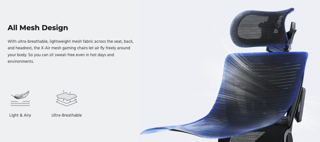 The X-Air ergonomic chair incorporates a full mesh construction across the backrest, seat, and headrest. Designed with tension-balanced mesh fabric tested for durability, the structure supports airflow without sacrificing spinal alignment.