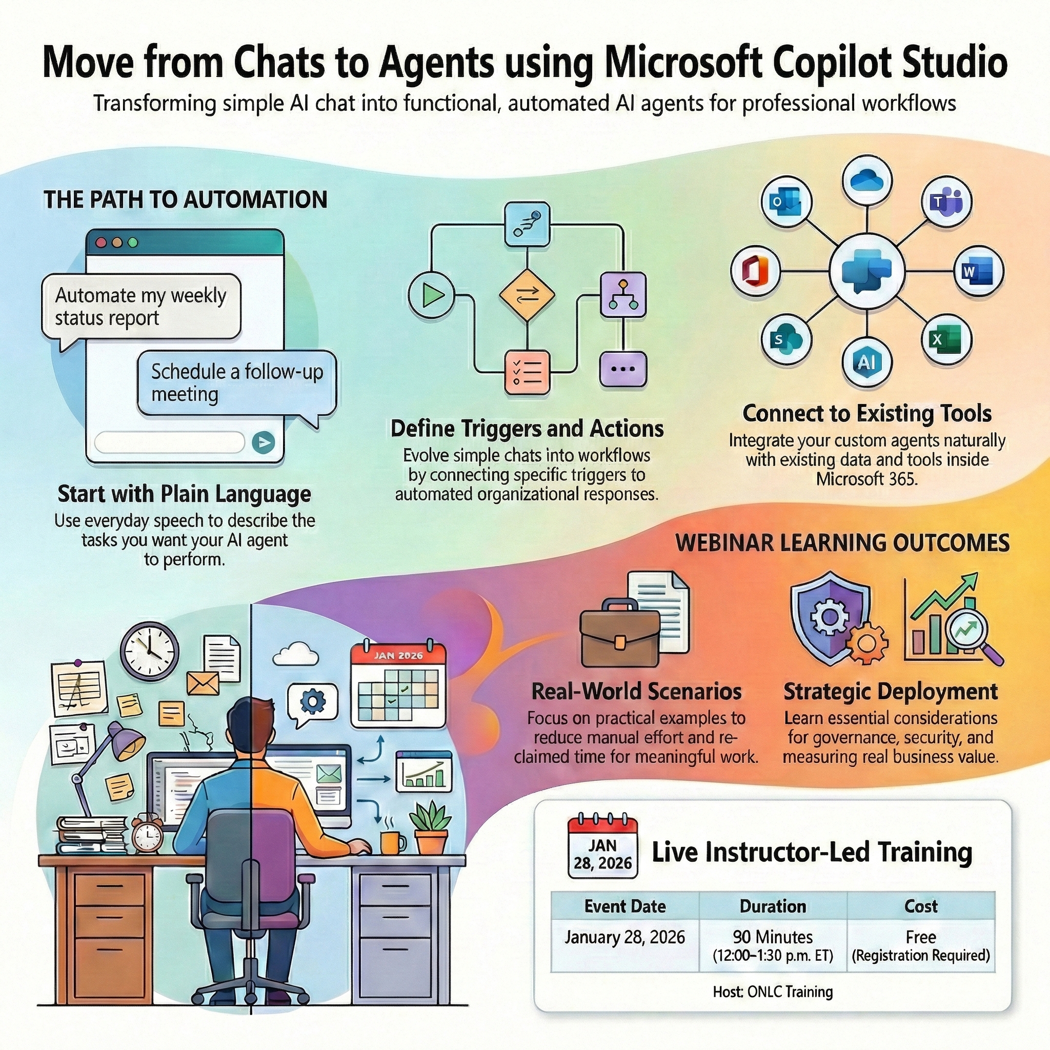 WILMINGTON, DE, UNITED STATES, January 21, 2026 /EINPresswire.com/ — AI doesn’t have to be complicated—or intimidating—to be useful at work. ONLC Training is hosting a free, 90-minute webinar that shows how Microsoft Copilot Studio helps professionals turn simple chat into practical, automated workflows across Microsoft 365. The online session, Microsoft Copilot Studio, takes place January 28, 2026, from 12:00–1:30 p.m. ET and gives attendees a hands-on look at how AI agents can support everyday tasks and team productivity while keeping people firmly in control.